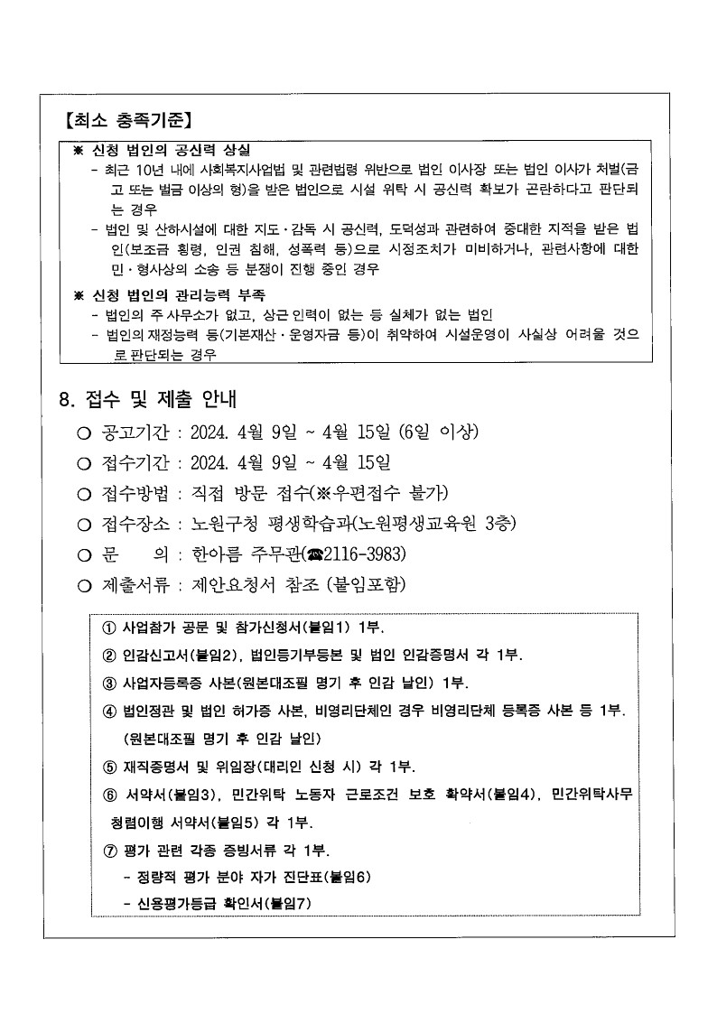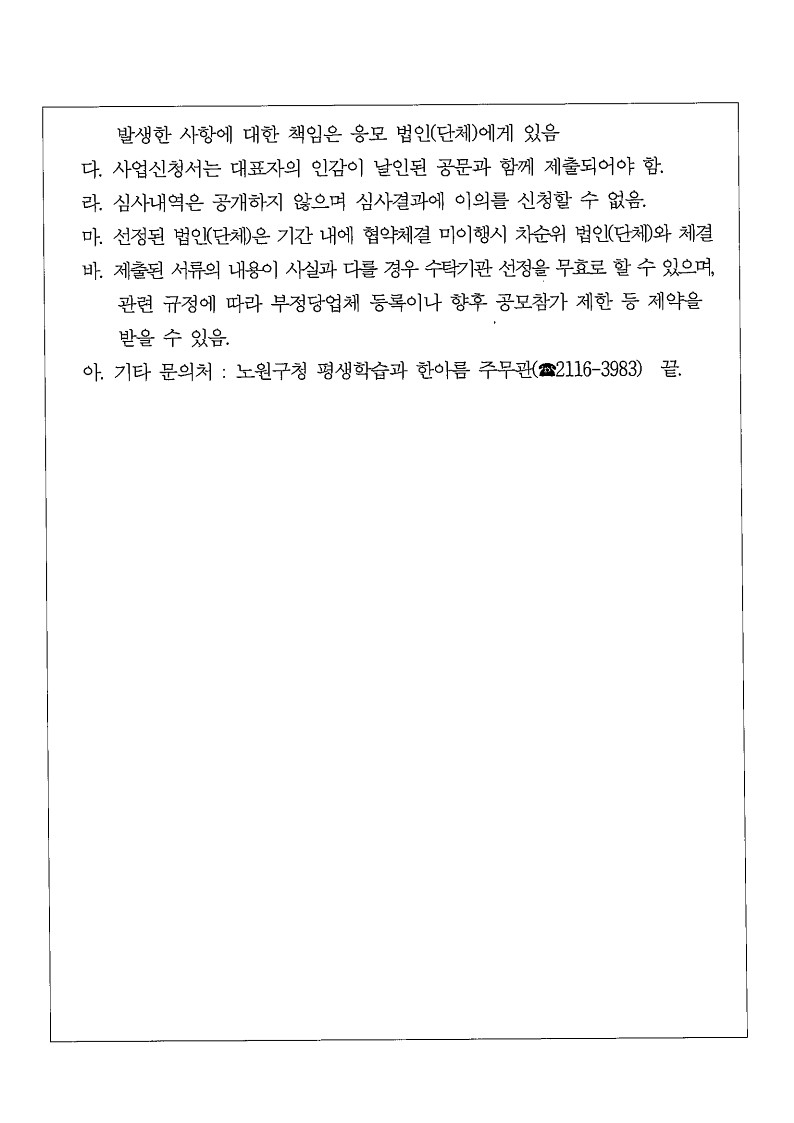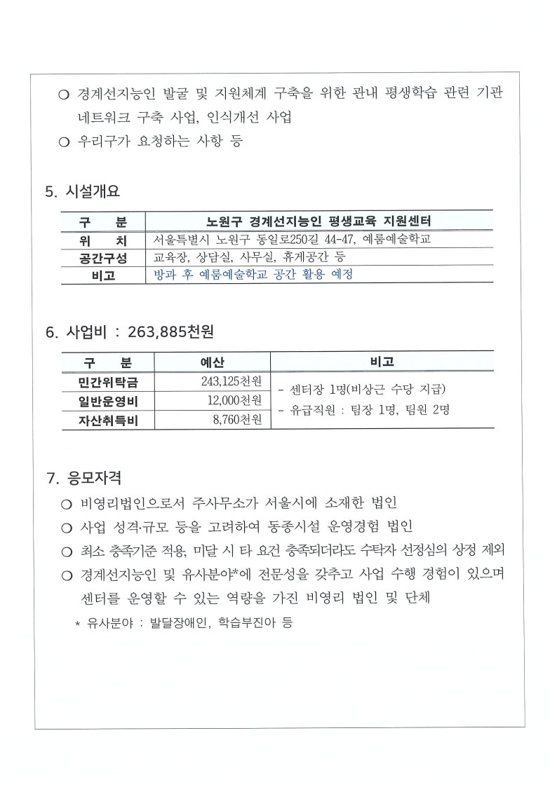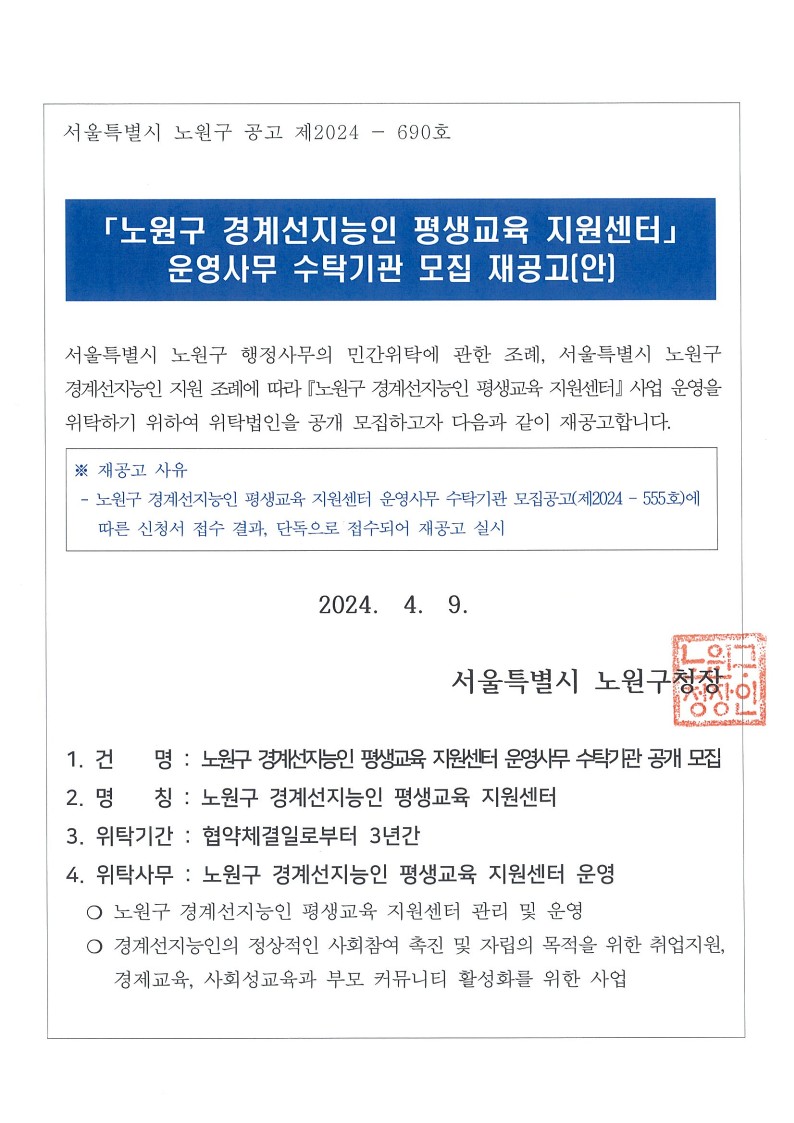 [전체공지] [노원구 경계선지능인 평생교육 지원센터]운영사무 수탁기관 모집 재공고