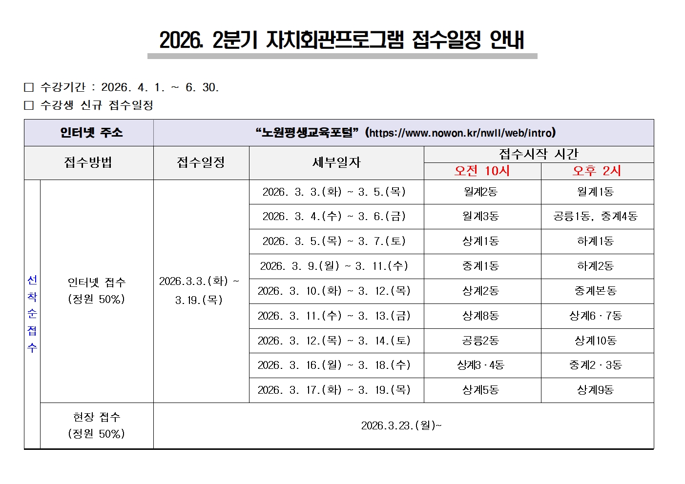 2026년 2분기 자치회관 프로그램 접수일정 안내