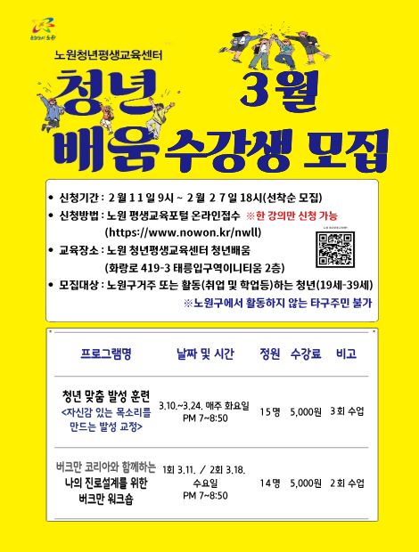 [전체공지] 노원 청년평생교육센터 청년배움 <3월 수강생 모집>