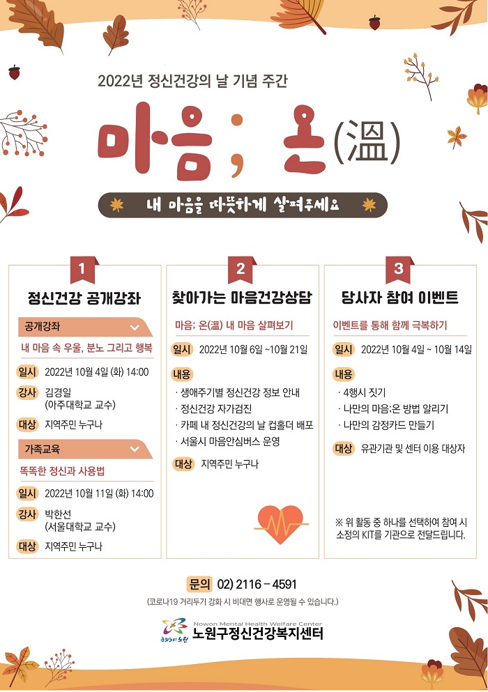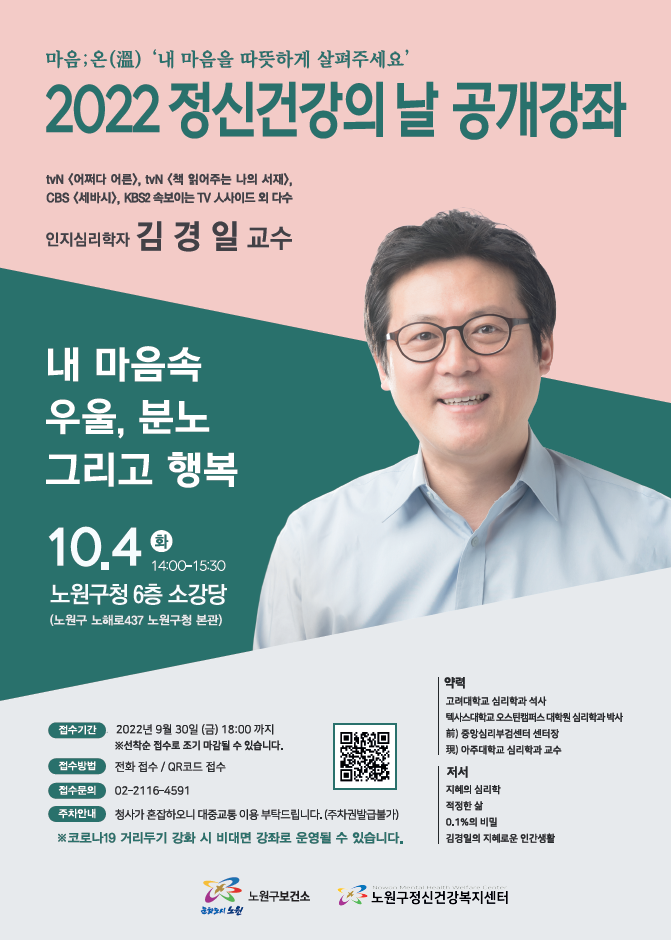 [전체공지] 노원구정신건강복지센터 - 김경일 교수의 <내 마음속 우울, 분노 그리고 행복> 정신건강의 날 공개강좌