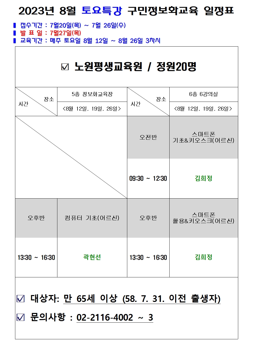 8월 구민정보화 토요특강 안내
