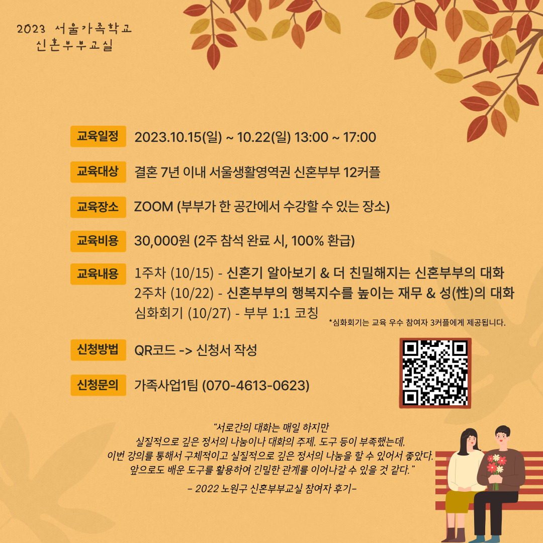 예쁜 가을날, 신혼부부교실을 통해 부부가 더 친밀해지는 시간을 가져보시길 추천드립니다!