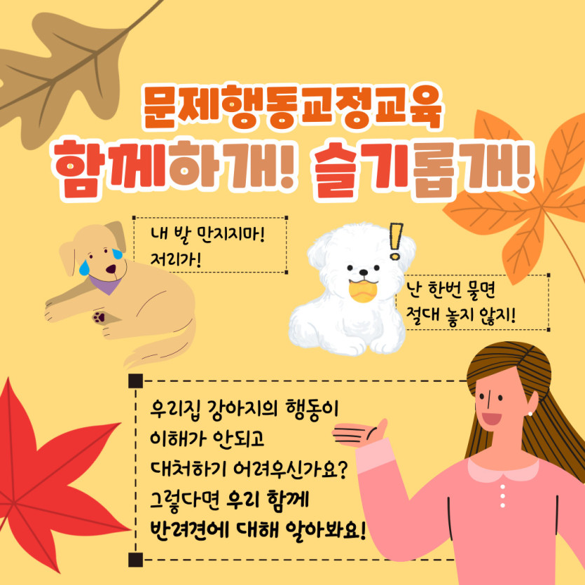 행동에 교정이 필요치 않아도 반려견에 대해 더 많이 알고 싶은 반려동물 가족의 많은 관심과 참여 부탁드립니다.