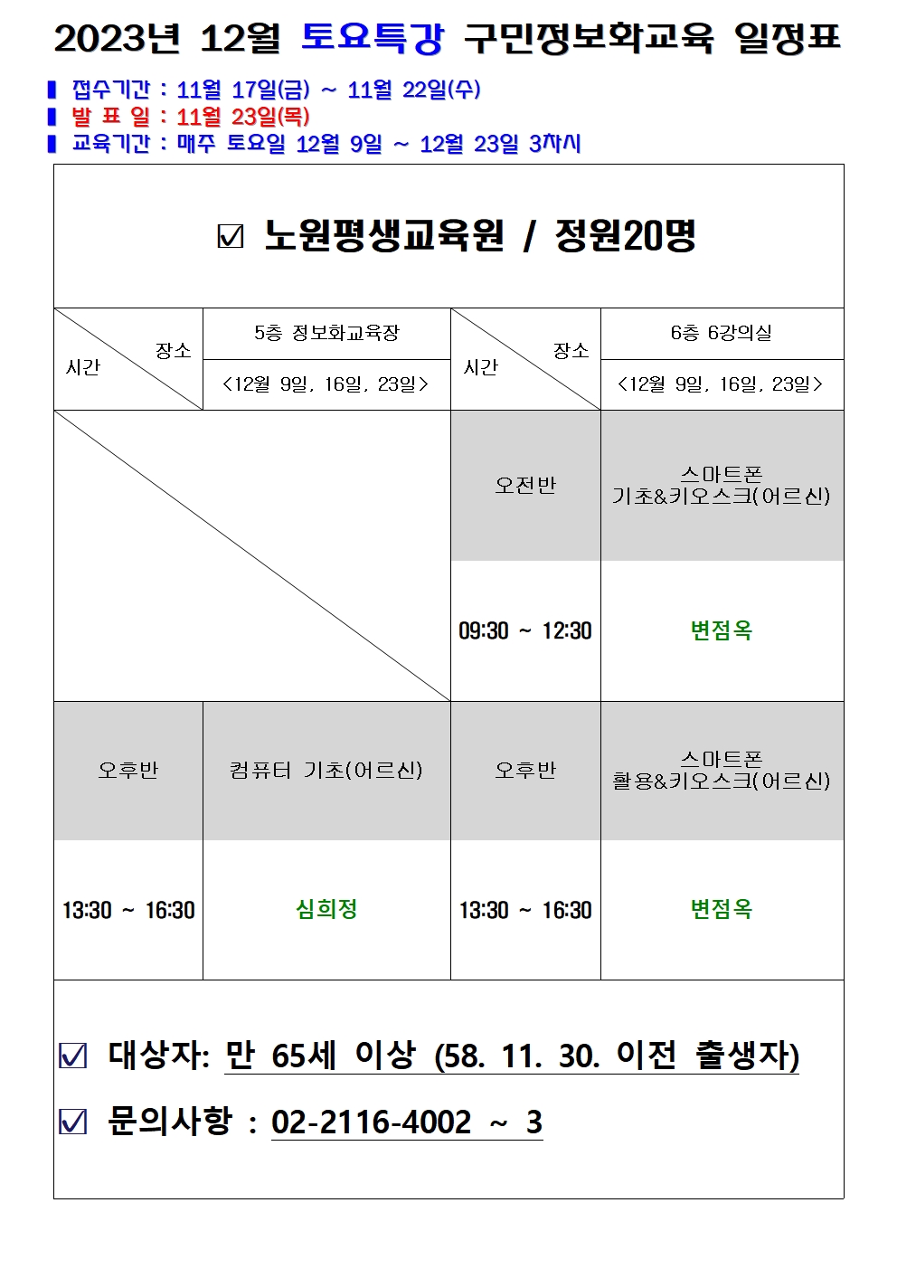 12월 구민정보화교육(토요특강) 수강생 모집 일정 안내