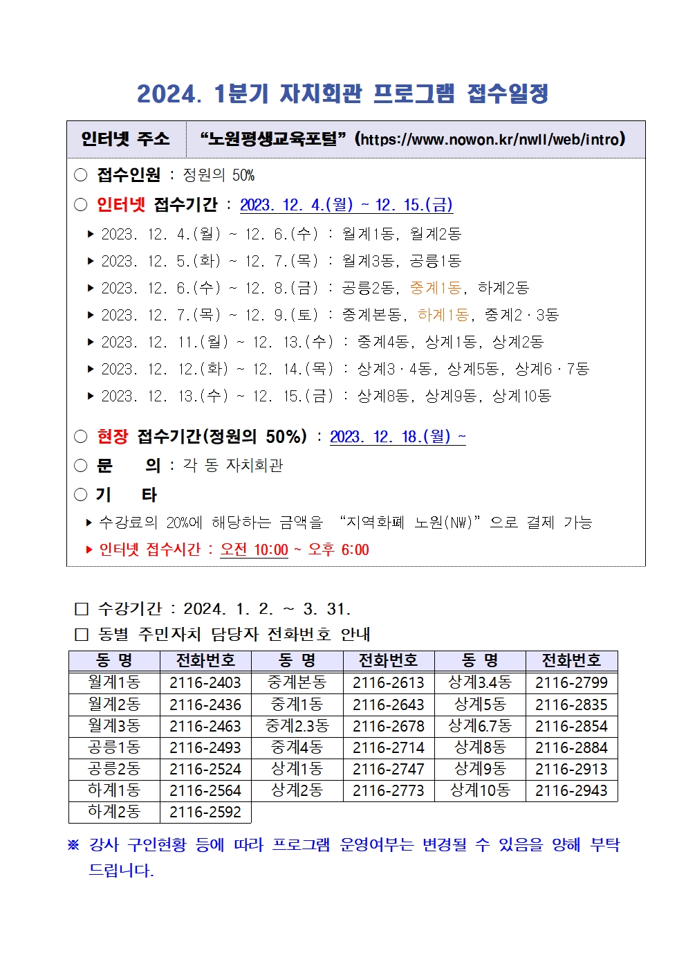 [노원평생교육원] 2024년 1분기 강좌 수강생 모집