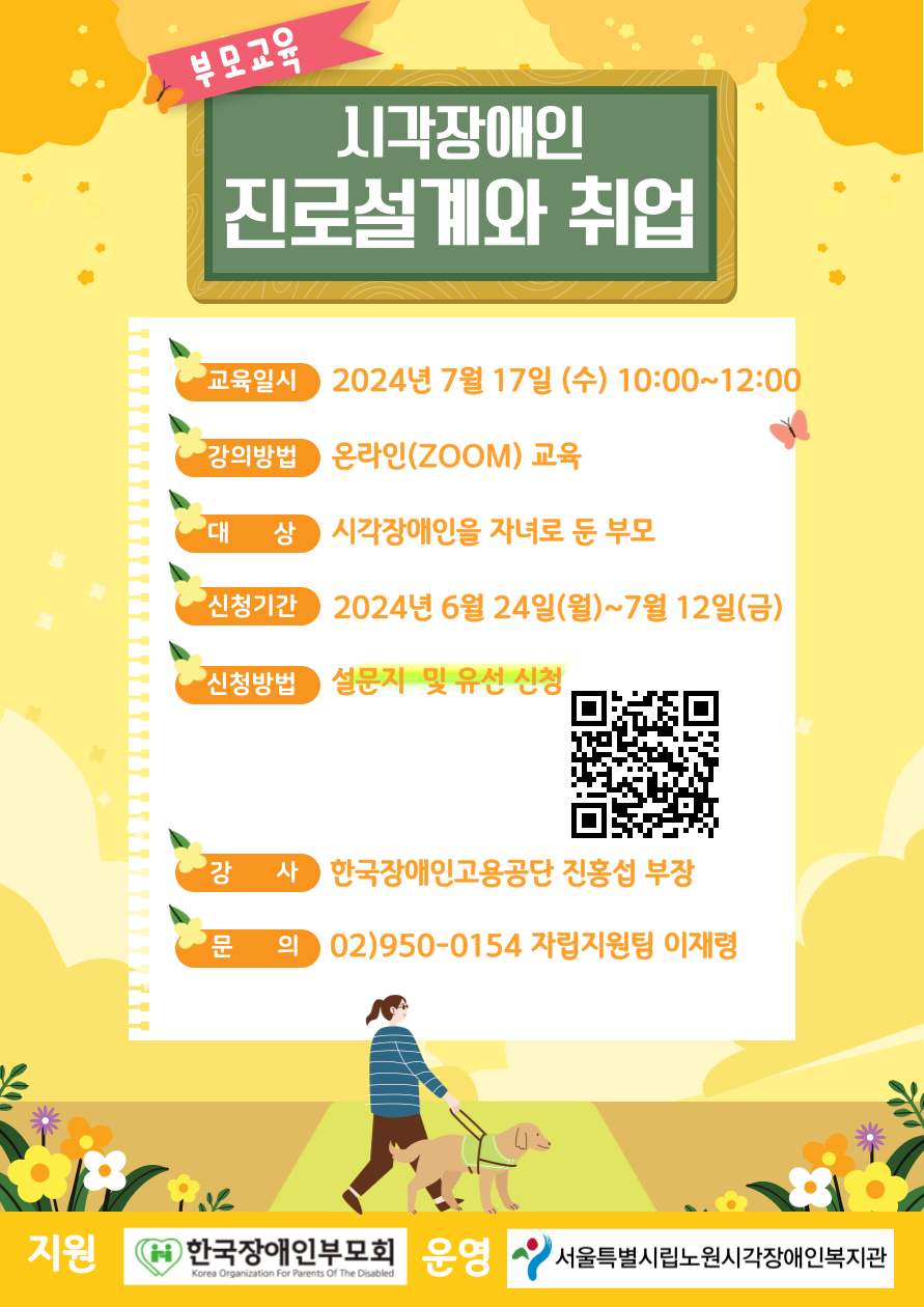 서울특별시립노원시각장애인복지관에서는 시각장애인의 지지체계 강화를 위해 부모교육을 아래와 같이 진행하고자 합니다. 자녀 진로관련 고민과 어려움에 도움을 드리고자 하오니 많은 관심과 신청 부탁드립니다.