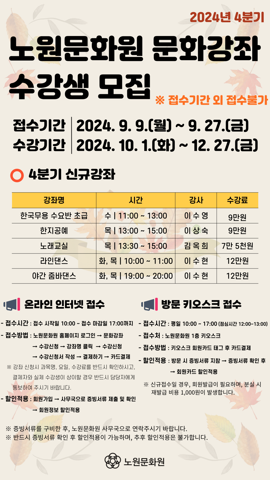※ 한국무용 수요반 초급, 한국무용 수요반 작품, 도살풀이 연구반은 노원문화원 방문접수만 가능하며, 할인적용이 불가합니다.
