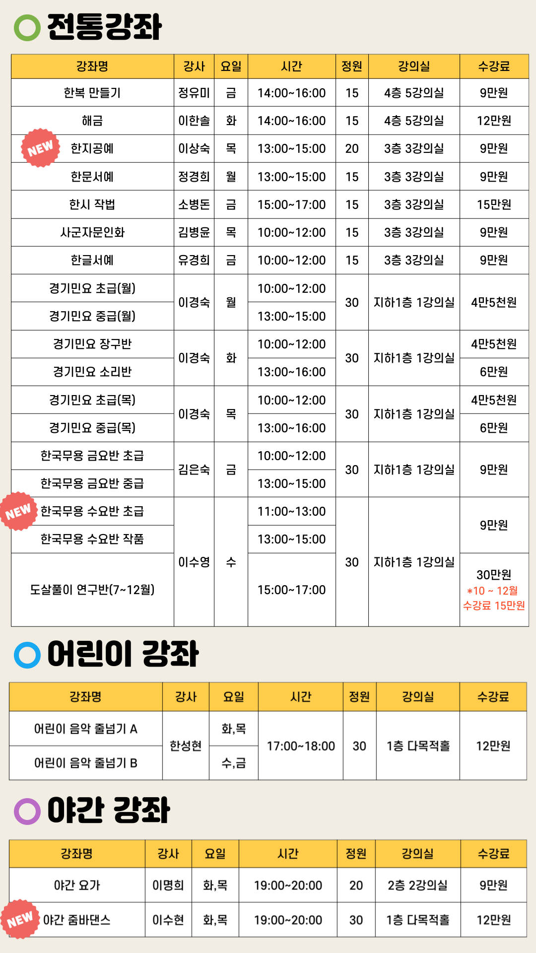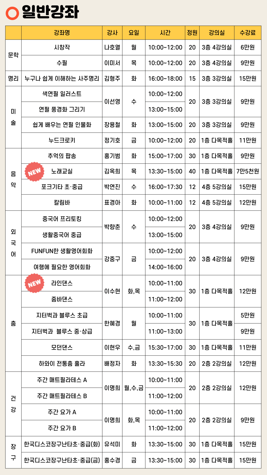 ※ 야간 줌바댄스, 노래교실, 라인댄스 등 신규강좌 5과목이 개설되었습니다.