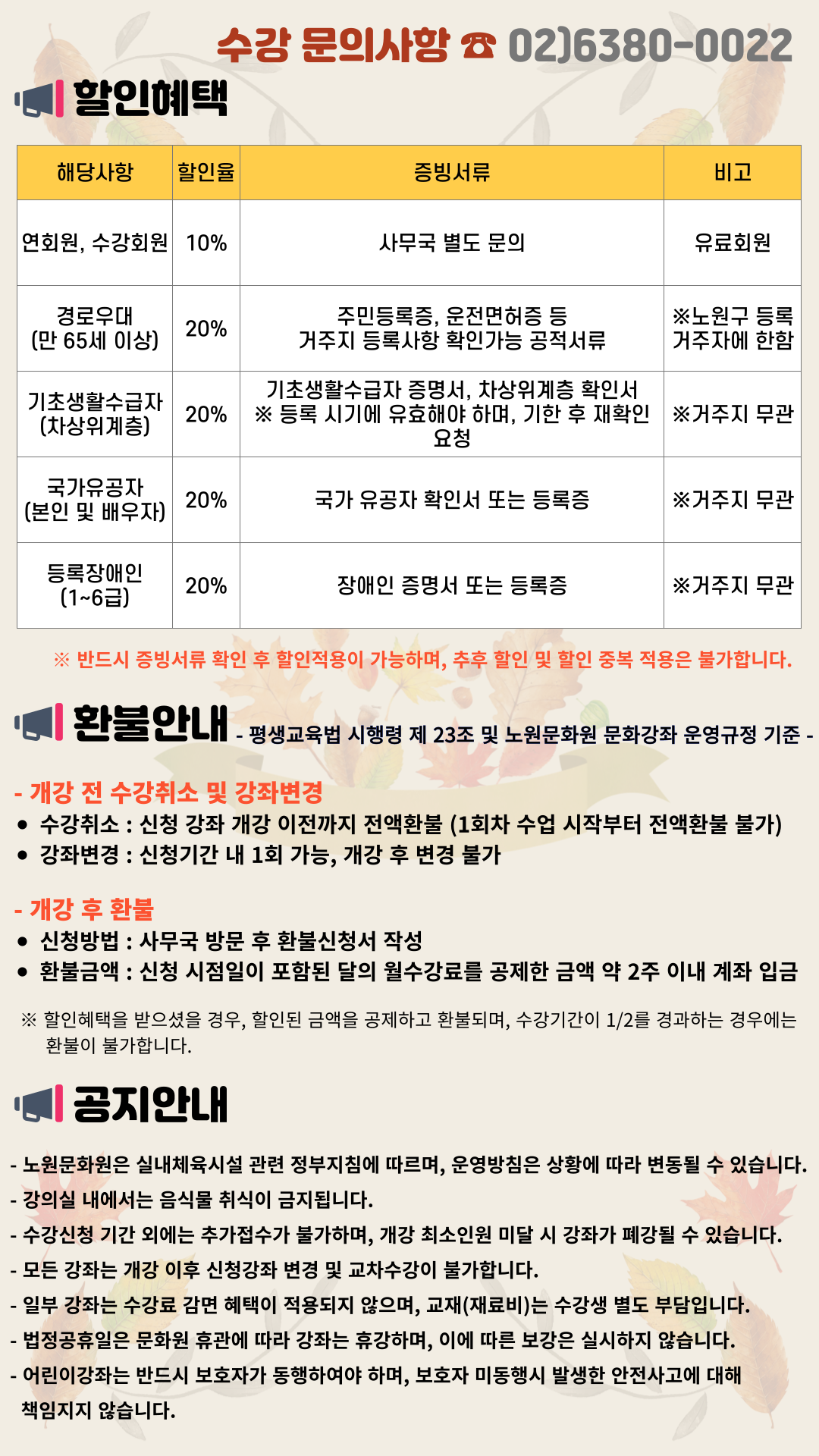 ※ 홈페이지 강좌 신청 시 할인혜택 적용을 희망하시는 경우 반드시 노원문화원 사무국으로 우선 연락 주시기 바랍니다.