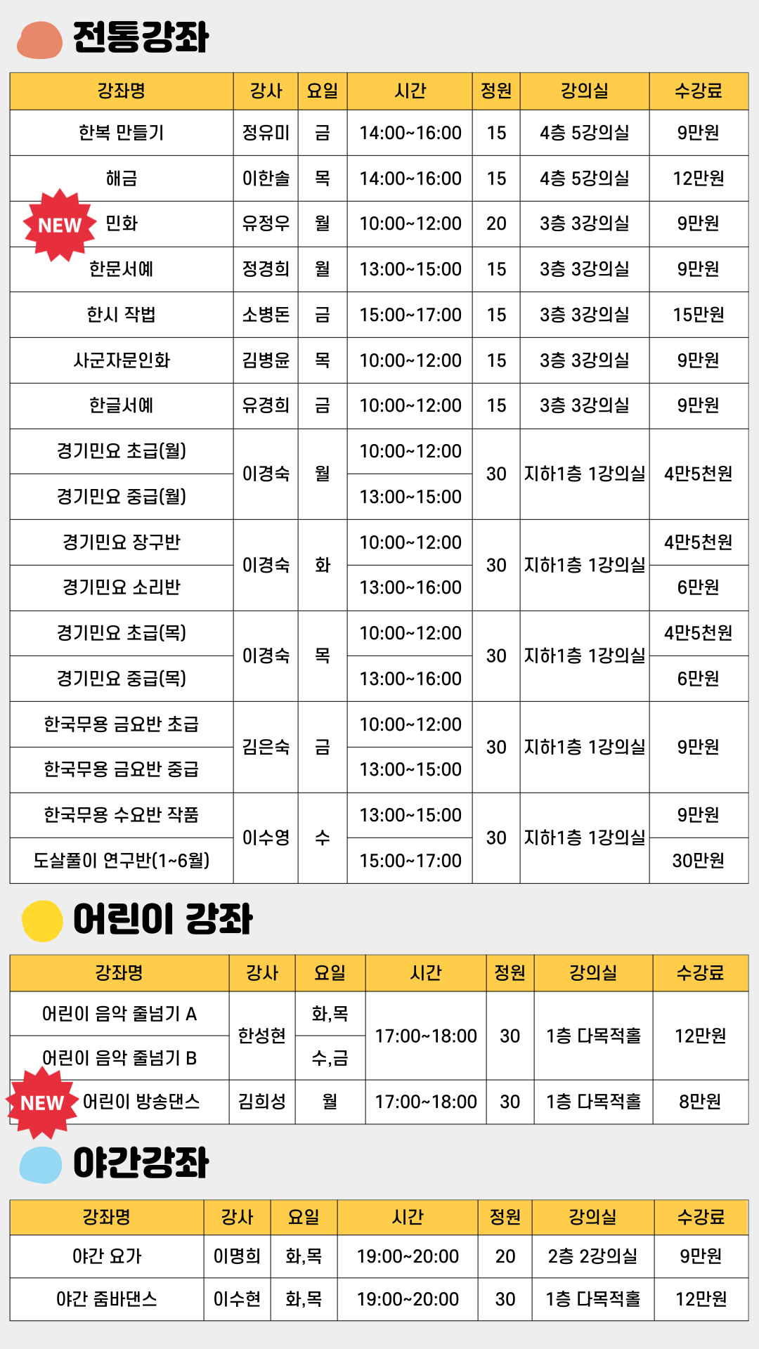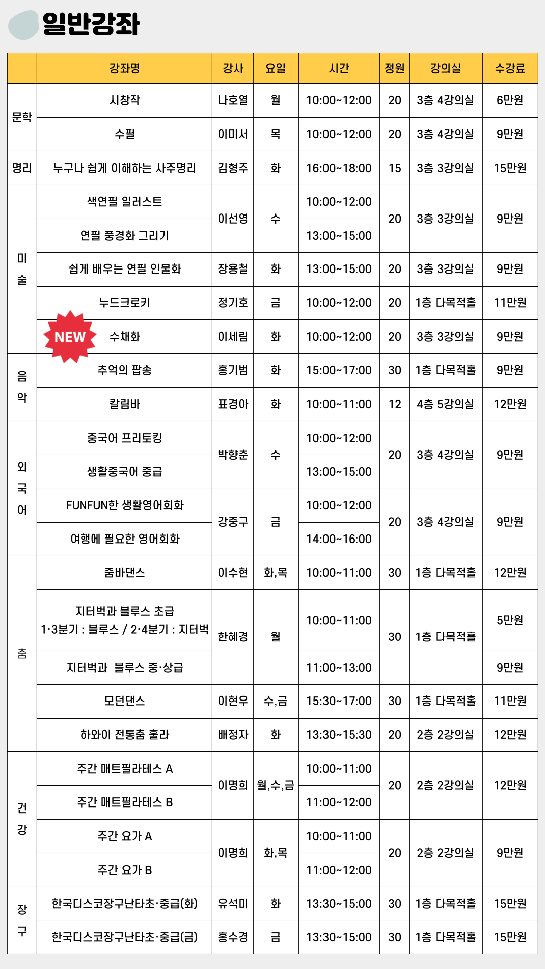 ※ 수채화, 민화, 어린이 방송댄스. 신규강좌 3과목이 개설되었습니다.
