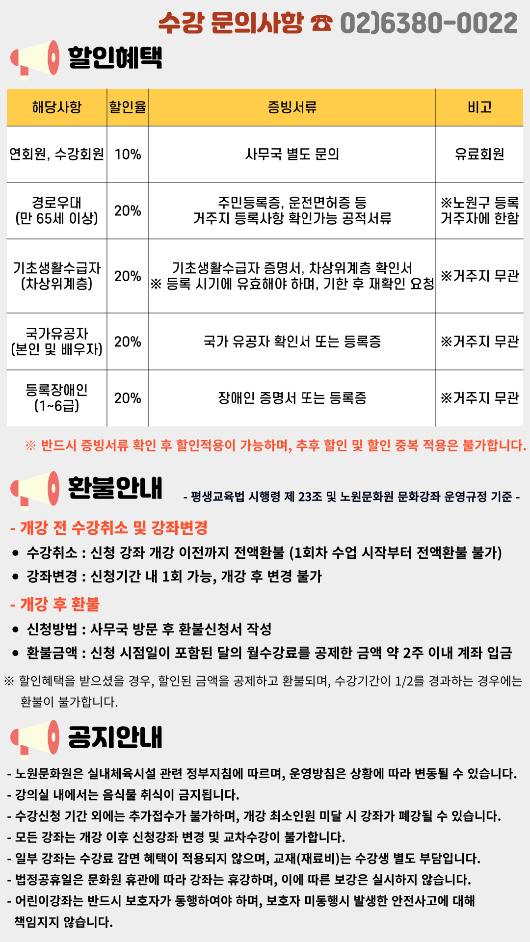 ※ 홈페이지 강좌 신청 시 할인혜택 적용을 희망하시는 경우 반드시 노원문화원 사무국으로 우선 연락 주시기 바랍니다.