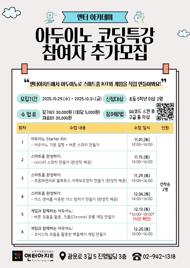 아두이노로 배우는 '스마트홈 IoT & 게임 만들기' 코딩 특강 참가자를 추가 모집합니다!