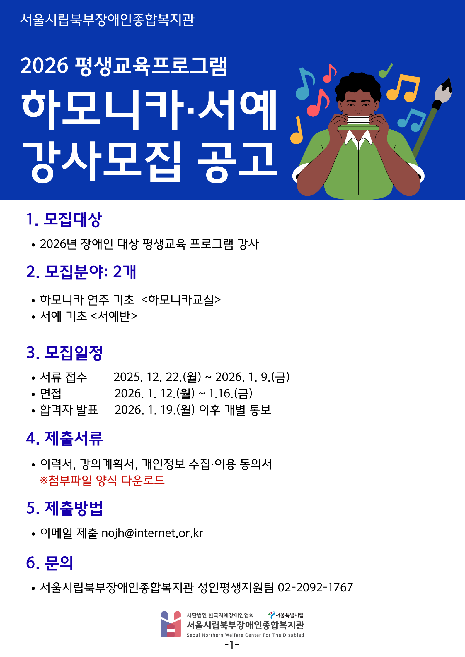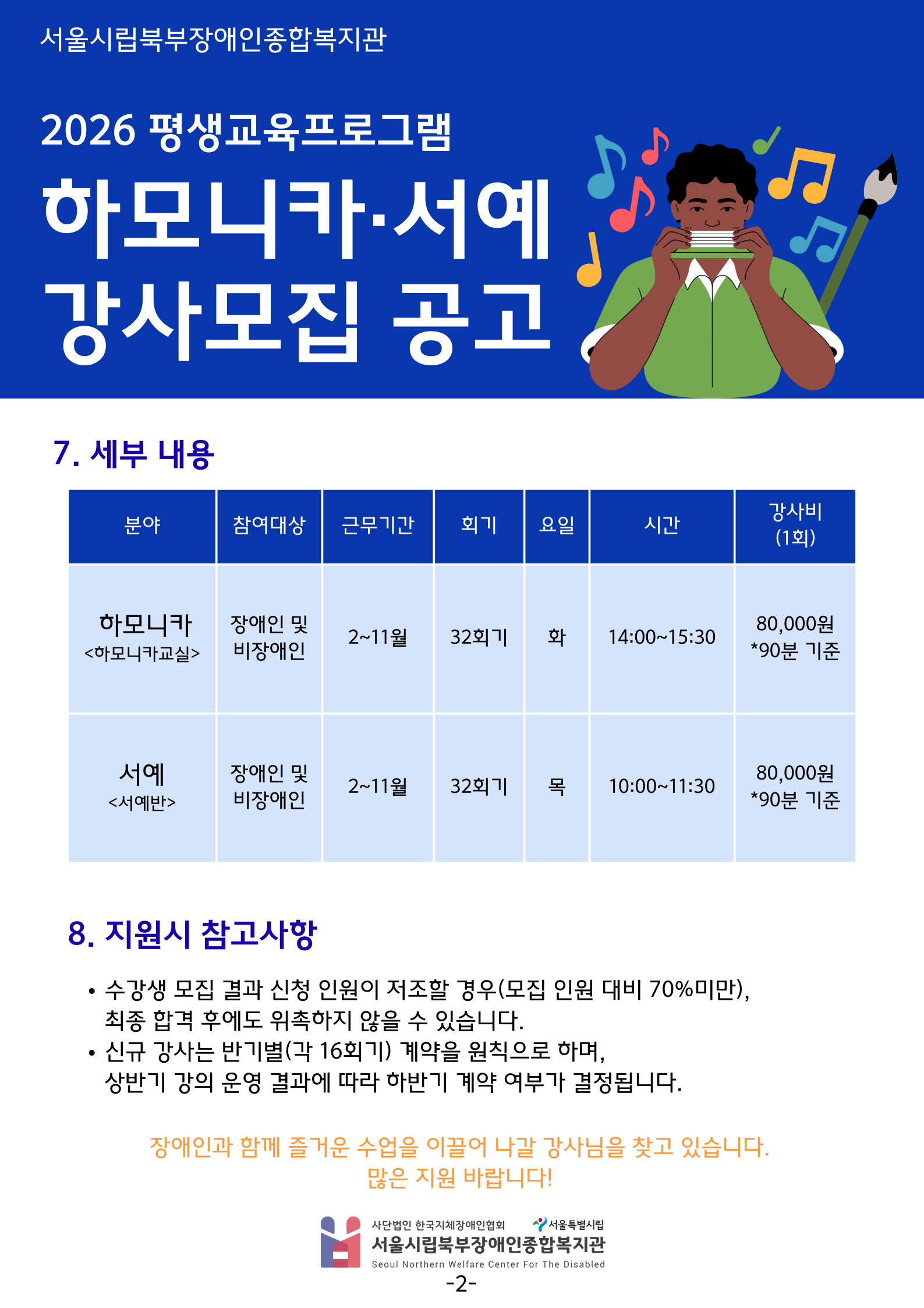 [노원구] 서울시립북부장애인종합복지관 2026년 평생교육 프로그램 강사 모집 공고(하모니카·서예)