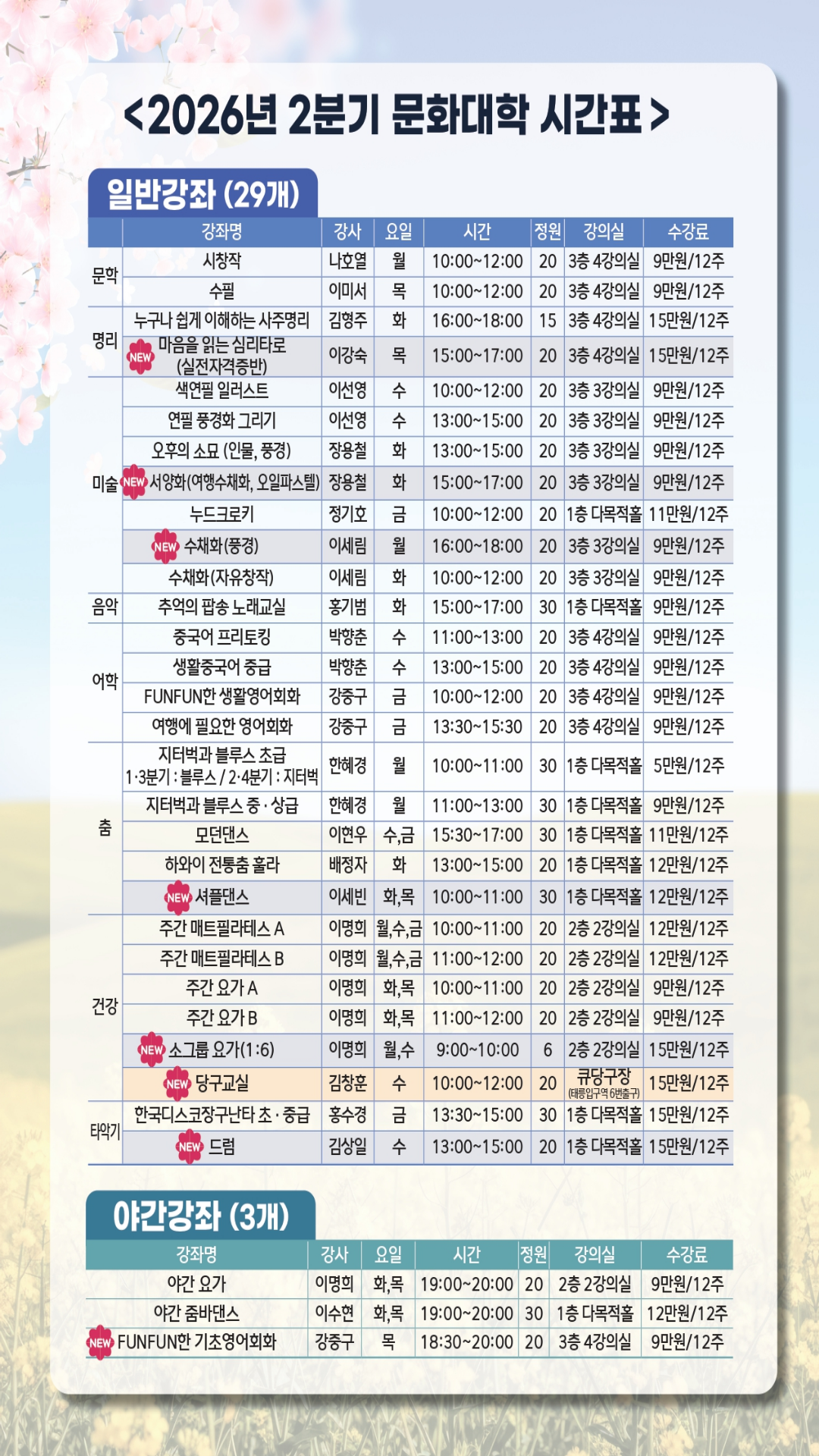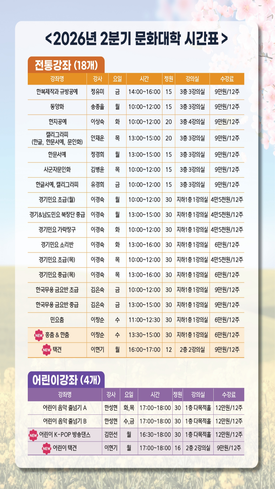 공지[노원구] [노원문화원] 2026년 2분기(4~6월) <노원문화원 문화대학> 접수안내