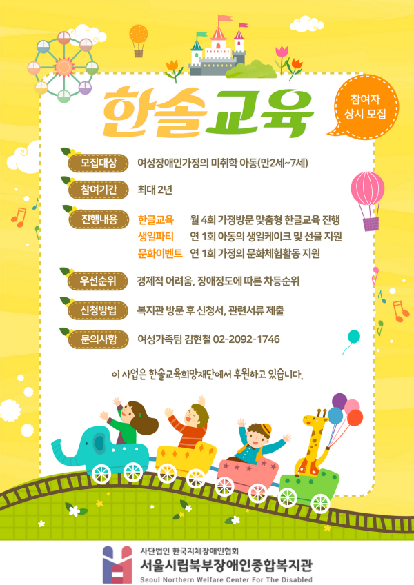 [상계동] [서울시립북부장애인종합복지관] "한솔교육에듀케어" 참여자 모집