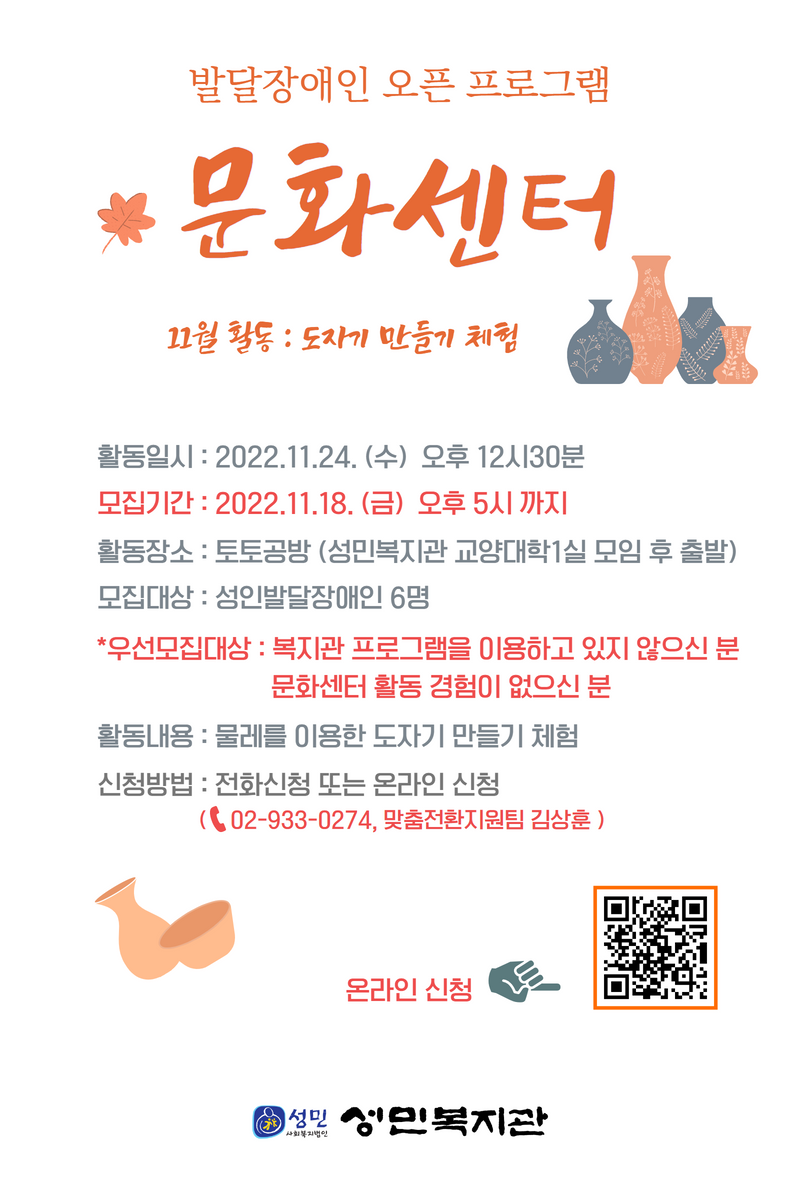 [상계동] [성민복지관] 2022 발달장애인 오픈프로그램 「문화센터」 11월 활동 참여자 모집
