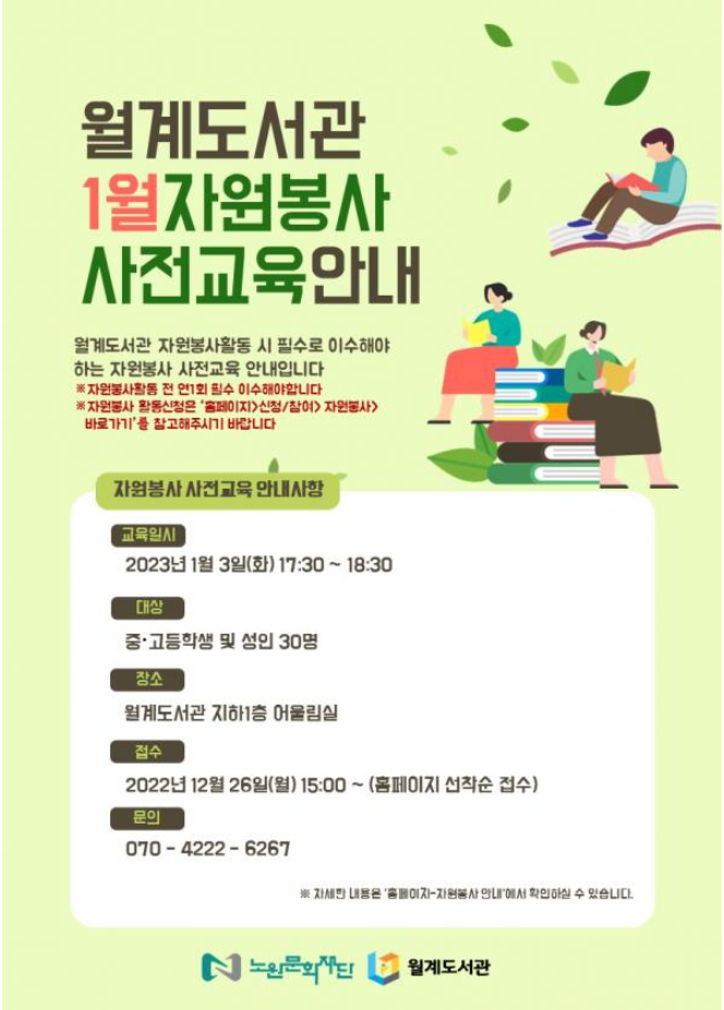 - 신청방법 : 하단의 URL 혹은 홈페이지 > 독서문화프로그램> 월계도서관 선택> [1월] 자원봉사 사전교육 신청