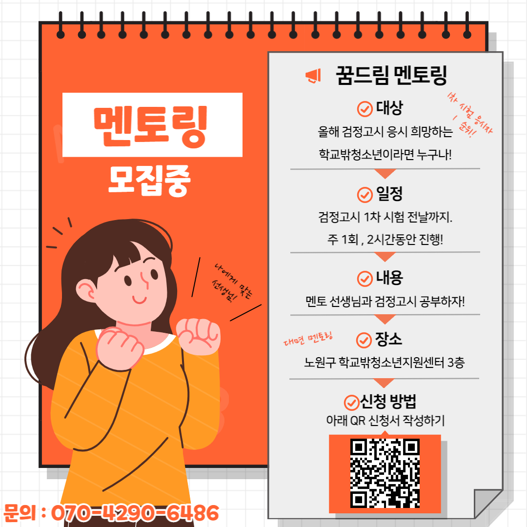 노원구 꿈드림 검정고시 멘토링 참여 희망하는 학교밖청소년은 신청해주세요.
