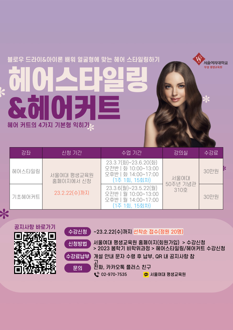 2023학년도 봄학기 평생교육원 비학위과정- 기초헤어커트/헤어스타일링