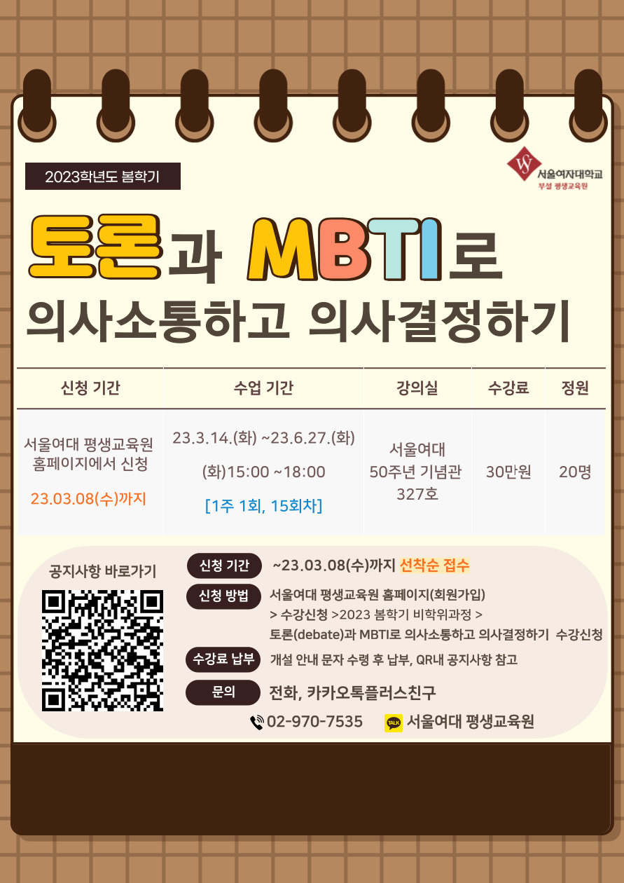 2023학년도 봄학기 평생교육원 비학위과정- 토론(Debate)와 MBTI로 의사소통하고 의사결정하기