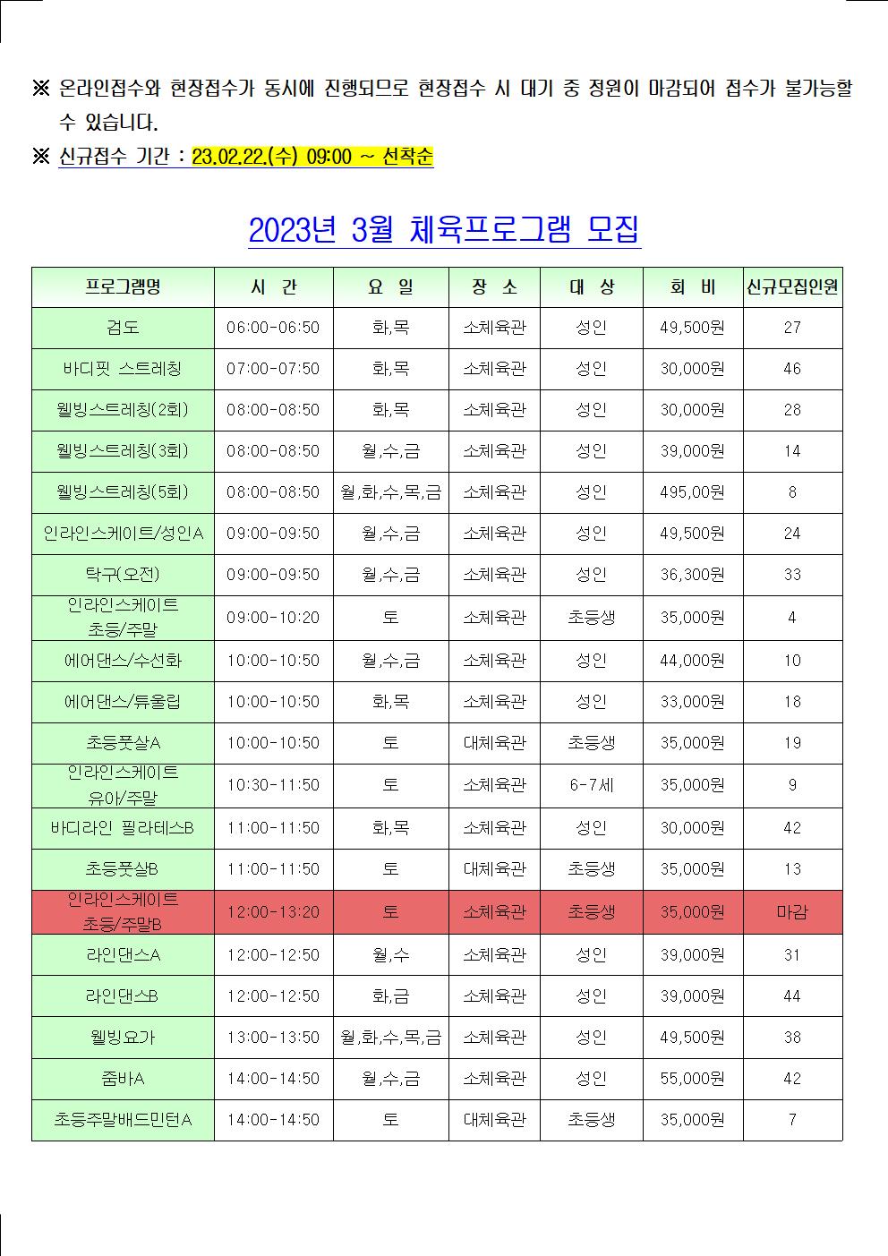 [월계동] 월계구민체육센터 - 2023년 3월 신규접수 안내