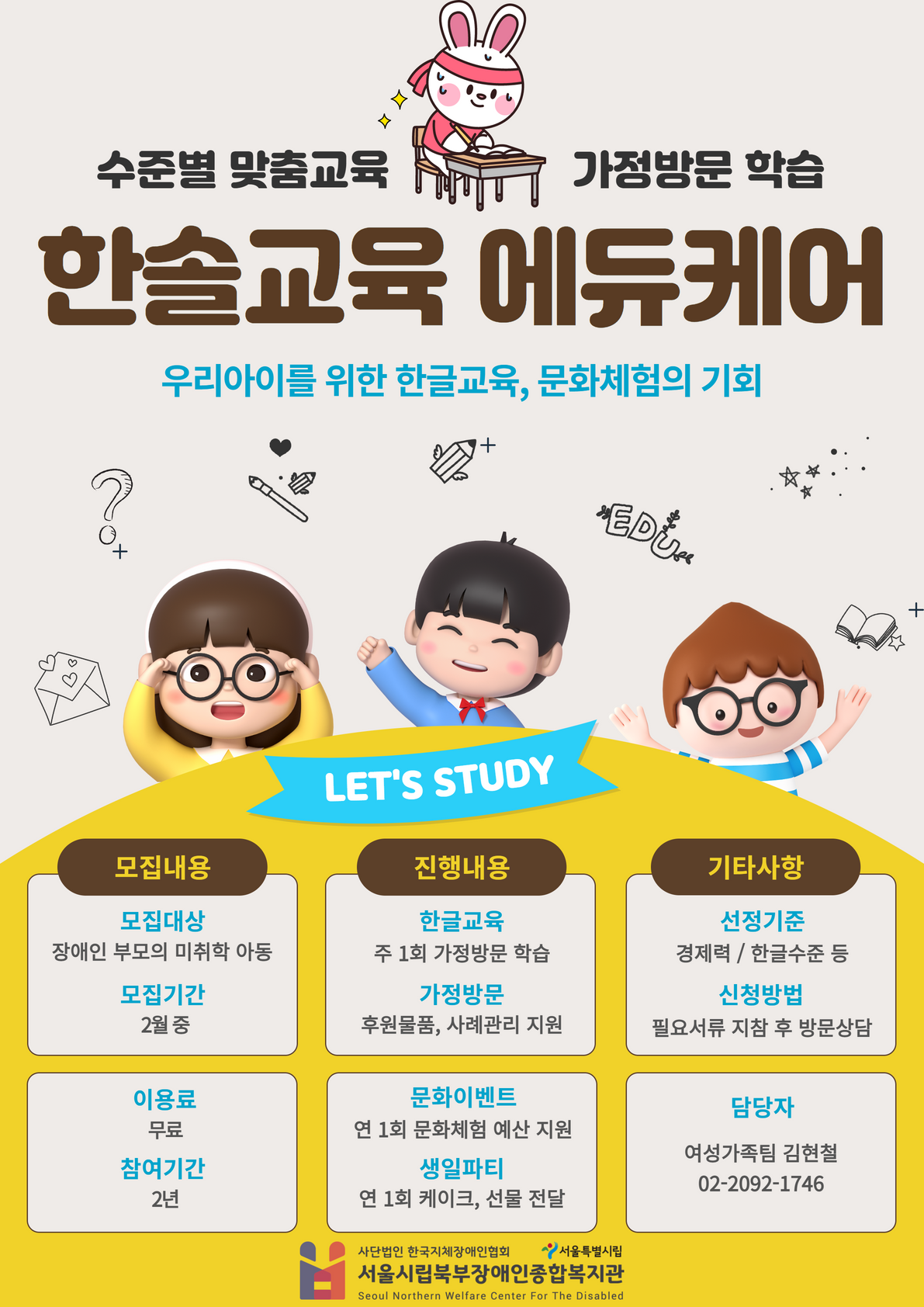 [상계동] [서울시립북부장애인종합복지관] "한솔교육 에듀케어" 신규가정 모집