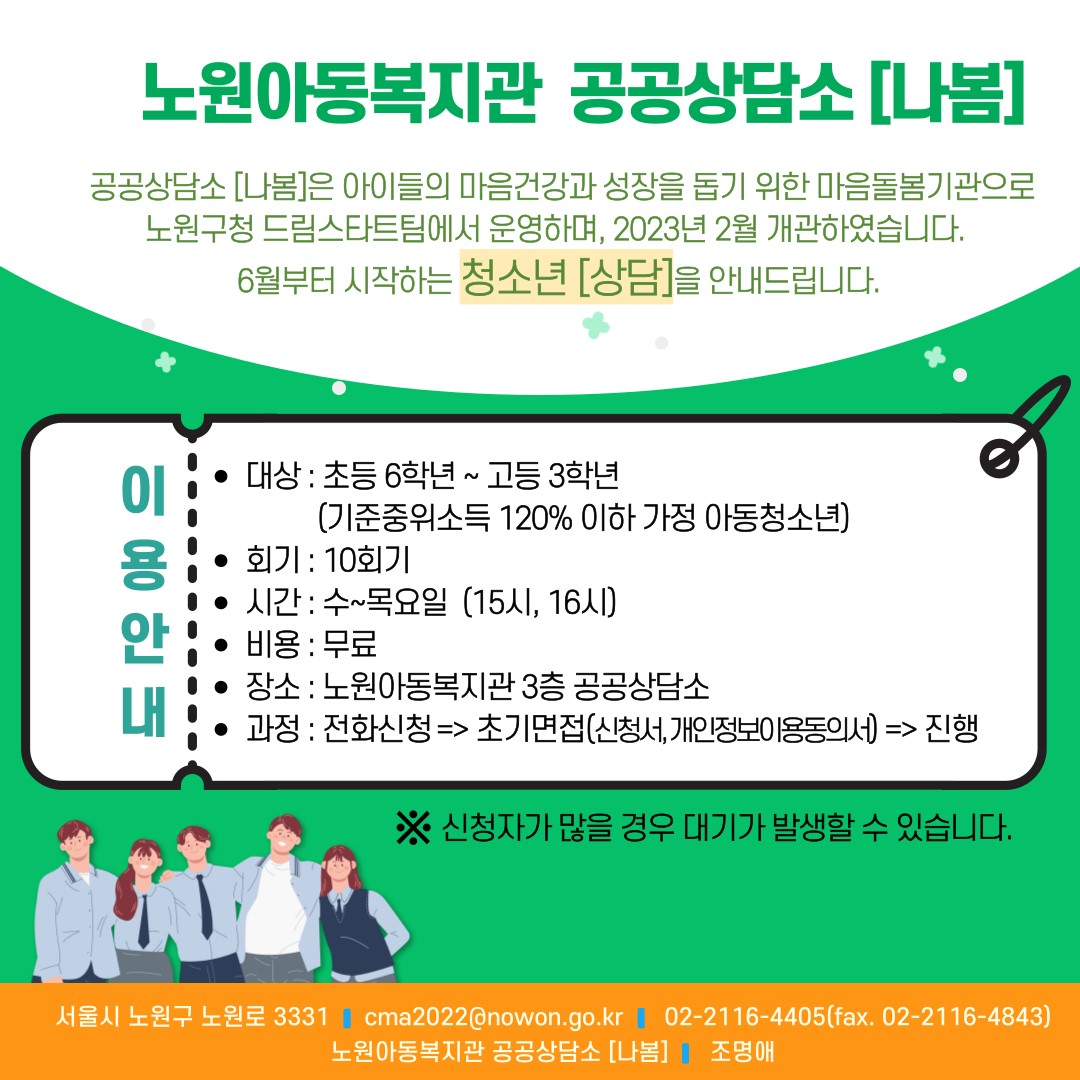 [중계동] 노원아동복지관 공공상담소 [나봄]에서 6월부터 청소년 상담을 시작합니다.