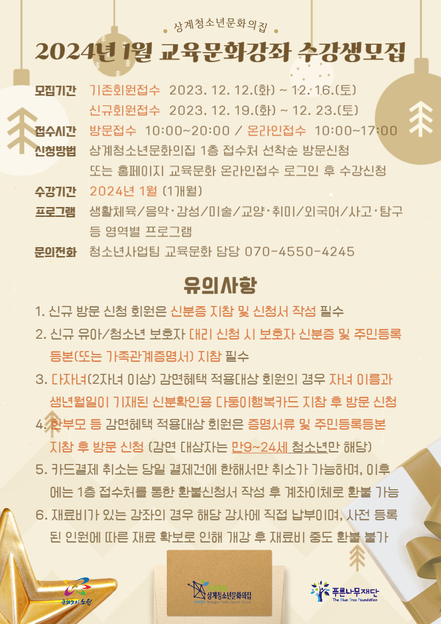 [상계동] 상계청소년문화의집 24년 1월 교육문화강좌 수강생모집