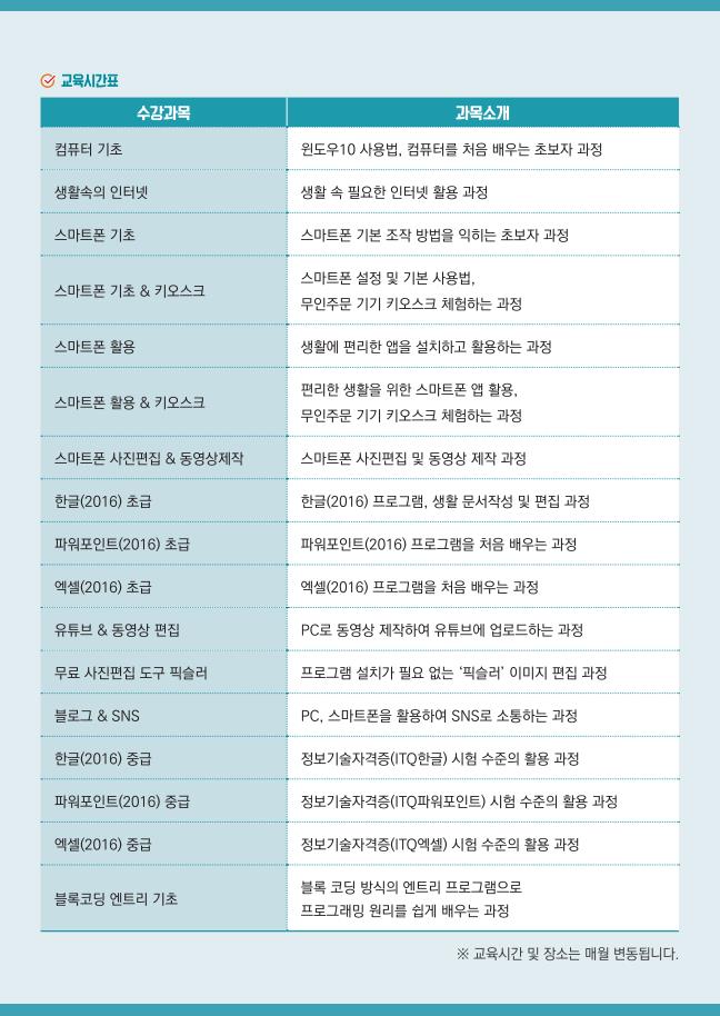 세대간 계층간 정보격차 해소를 목적으로 컴퓨터를 접해본적이 없는 정보소외계층을 대상으로 합니다.