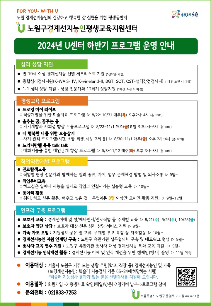 경계선지능인의 건강하고 행복한 삶 실현을 위한 평생 동반자 노원구 경계선지능인 평생교육지원센터 유센터 입니다!