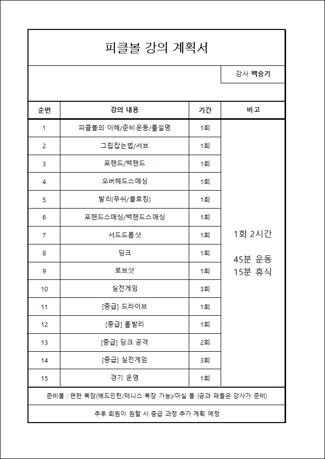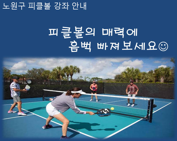 피클볼| 강사소개 & 강좌설명 | 남녀노소 누구나 쉽게 할수있는 구기종목으로, 테니스 배드민턴 탁구를 접목시킨 운동입니다. 현재 미국에서 선풍적인 인기를 얻고 있습니다. 플라스틱공과 작은패들을 사용하여 쉽고 재미있으며 부상의 염려또한 적습니다 또한 새로운 기술들이 날로 발전되어 활동적이고 민첩성이 요구되는 경기로 변모되고있습니다. |