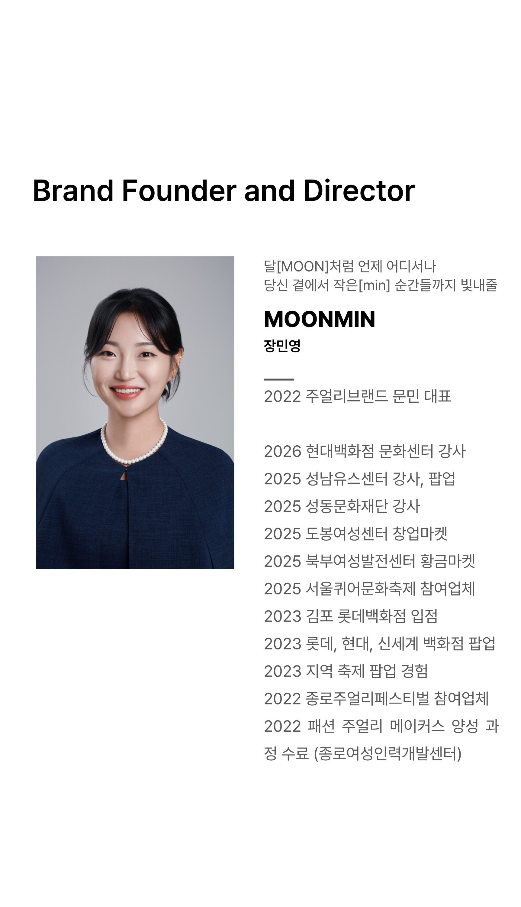 | 자격증 & 이력사항 | 문민 장민영대표 2022 주얼리브랜드 문민 대표 2026 현대백화점 문화센터 강사 2025 도봉여성센터 창업마켓 2025 북부여성발전센터 황금마켓 2025 성동문화재단 강사 2025 서울퀴어문화축제 참여업체 2023 김포 롯데백화점 입점 2023 롯데, 현대, 신세계 백화점 팝업 2023 지역 축제 팝업 경험 2022 종로주얼리페스티벌 참여업체 2022 패션 주얼리 메이커스 양성 과정 수료 (종로여성인력개발센터) |